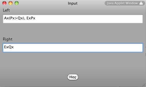 Constructing the tableauAfter you filled in the formulas correctly (the program warns you if you have made syntax errors), you start the tableau by clicking the Hopsa-button which you find under the text fields in the Input-window.A large green colored window pops up with the starting sequent on top.